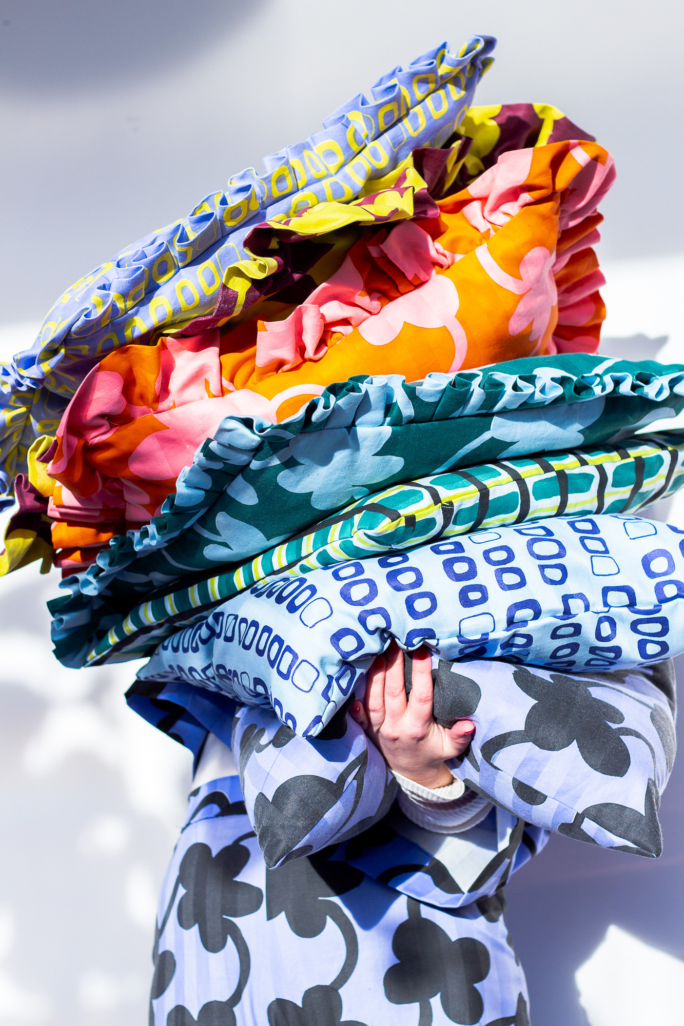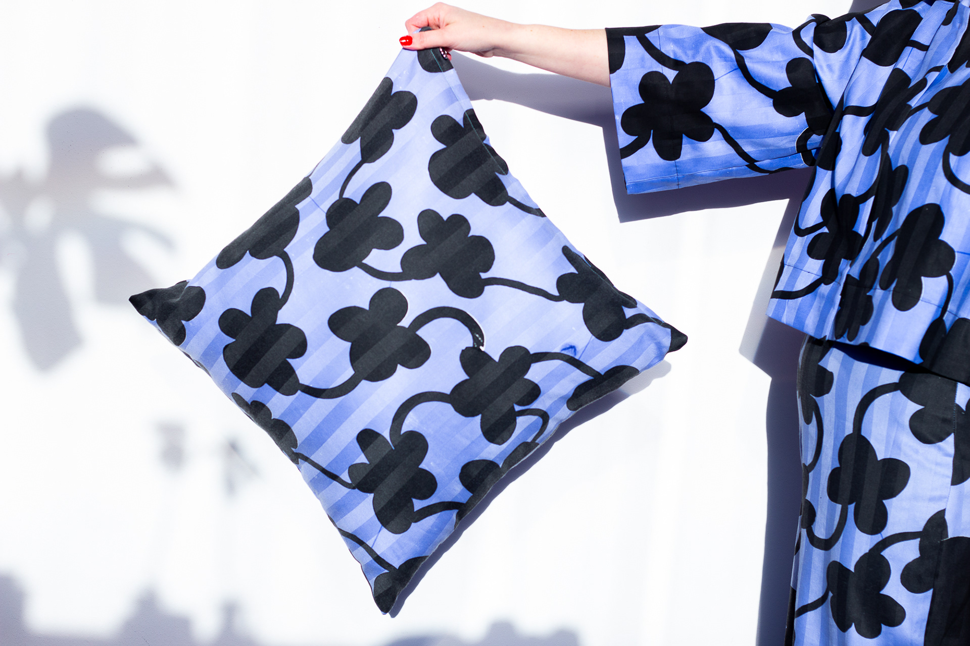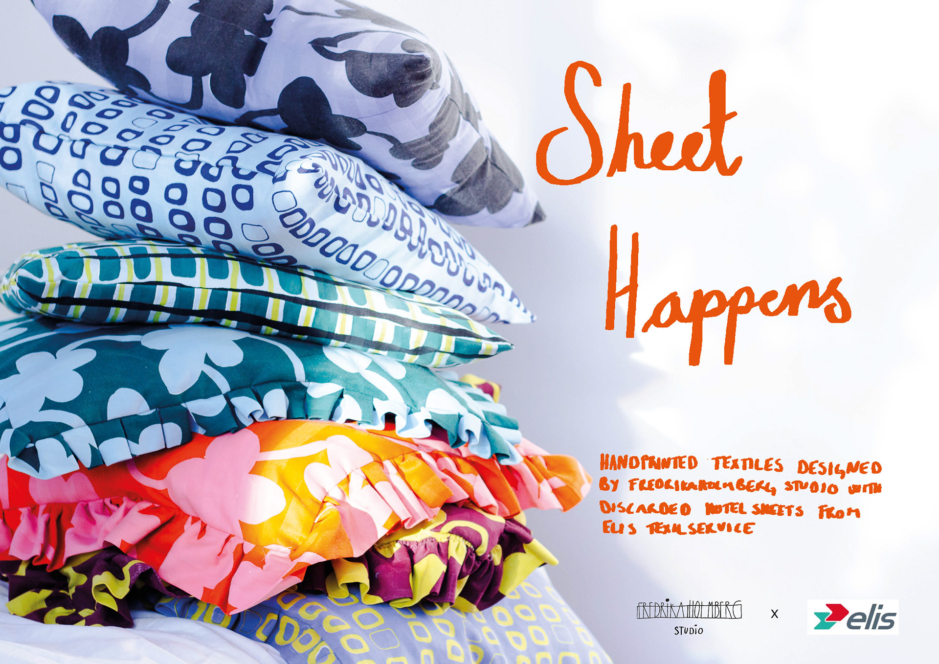 En materialundersökning i samarbete med Elis Textilservice. Hotell-lakan som sorterats ut från Elis tvätterier på grund av mindre fläckar och revor. Lakanen har sedan fått nytt liv genom nyformgivna mönster som applicerats på lakanen genom screentryck. Lakanets egna ränder lyser igenom den nya designen som en liten viskning om dess ursprung!